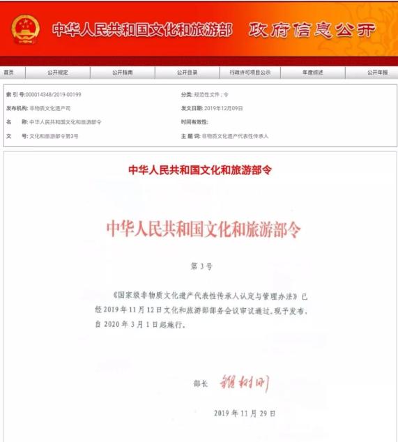 《国家级非物质文化遗产代表性传承人认定与管理办法》已经2019年11月12日文化和旅游部部务会议审议通过。现予发布,自2020年3月1日起施行。