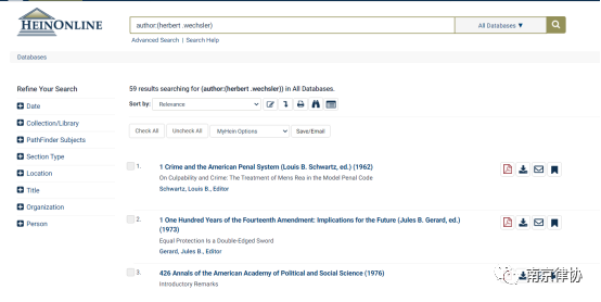 如:在搜索栏中输入美国著名宪法学者Herbert.Wechsler的作者名,可以检索到其著作,点击“sort by”可以选择按关联度、时间、引用次数、访问人数等标准进行从高到低或从低到高的文章排序。