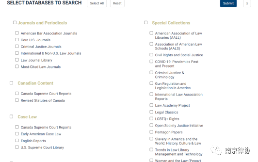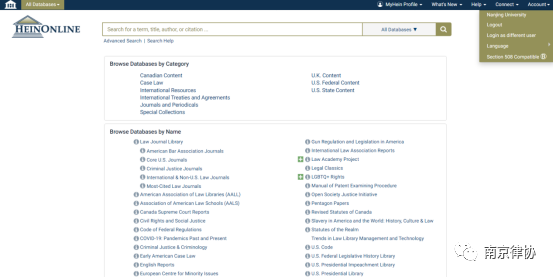 若需缩小检索范围,也可以点击搜索框最右方的“All Database”所有数据库,其页面中包含9类子库:Journals and Periodicals、Canadian Content、Case Law、International Resources、International Treaties and Agreements、Special Collections、U.K. Content、 U.S. Federal Content、 U.S. State Content。随后可以按检索主题来勾选所需的数据库范围。当然,也可以从下方的“Browse Databases by Category”和“Browse Databases by Name”,按类别或者按名称来浏览子库中的相关文章。