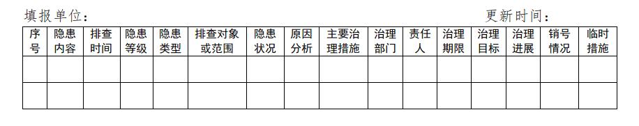 隐患数据库应当包括隐患内容、排查时间、隐患等级、治理措施、治理部门和责任人、治理期限、销号情况等内容,其中,重大隐患数据库还应当包括排查部门、隐患类型、排查对象或范围、隐患状况、原因分析、主要治理措施、治理目标、治理进展、临时措施等内容。
