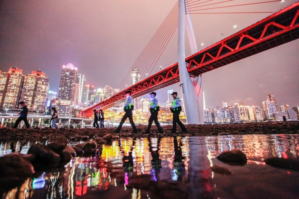 公安民警在嘉陵江滩网红打卡地巡逻防控