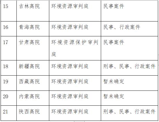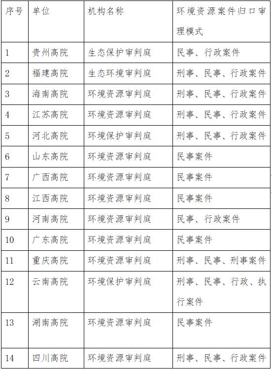 推进环境资源案件归口审理。环境资源审判的多元司法功能以及环境资源案件的高度专业技术性和公法私法融合、公益私益交织的复合性特征,要求环境资源审判工作实行刑事、民事、行政案件由一个审判庭集中审理的工作模式。最高人民法院在实现环境资源民事、行政案件 “二合一”归口审理的基础上,于2017年起在第三巡回法庭实行环境资源刑事、民事、行政案件由一个审判团队统一审理的“三合一”归口审理模式。在最高人民法院的推动下,截至2017年6月,在已经设立专门环境资源审判庭的21个高级人民法院中,有12个高级人民法院实现案件归口审理。其中,贵州、河南、青海实行民事、行政“二合一”归口审理模式;福建、江苏、河北、重庆、海南、四川、新疆、陕西实行刑事、民事、行政“三合一”归口审理模式;云南实行刑事、民事、行政以及公益诉讼案件执行“三加一”归口审理模式。河南省高级人民法院在实行“二合一”归口审理模式的同时,探索环境资源审判机构与刑事审判机构共同开展环境资源刑事审判指导工作。海南省高级人民法院制定《关于在部分法院推行环境资源案件“三合一”归口审理的意见(试行)》,规定在海南省高级人民法院、5个中级人民法院和3个基层人民法院实行环境资源案件“三合一”归口审理。部分尚未实行归口审理的高级人民法院,也开始在中级、基层人民法院层面探索案件归口审理。依据江西省高级人民法院指定,九江市中级人民法院出台《环境资源审判“三合一”试点工作方案》,在九江市中级人民法院和武宁县人民法院试行环境资源案件“三合一”归口审理。云南省高级人民法院制定《云南省环境资源案件受案范围(试行)》,确定环境资源刑事案件包括危害公共安全罪涉及生态保护案件、破坏社会主义市场经济秩序罪涉及生态保护案件、妨害社会管理秩序罪涉及生态保护案件、渎职罪涉及生态保护案件四大类共计31个案由;确定环境资源民事案件包括公益诉讼、省级政府提起的生态环境损害赔偿诉讼、与自然环境相关的侵权纠纷、与自然资源相关的合同纠纷、与自然资源相关的物权纠纷五大类共29个案由;确定环境资源行政案件包括行政公益诉讼等共4个案由,对明确归口审理的环境资源案件范围作出了有益的探索。