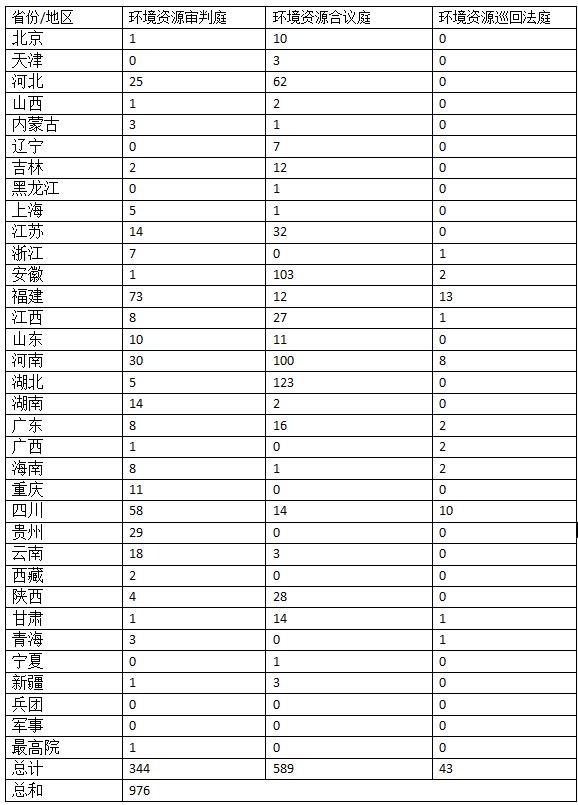 最高人民法院加大对环境资源审判机构建设的督促和指导力度。截至2017年6月,各级人民法院共设立环境资源审判庭、合议庭和巡回法庭976个。其中专门审判庭344个,合议庭589个,巡回法庭43个。2017年2月,青海省玉树市中级人民法院设立三江源环保法庭,对于加强三江源区域环境治理,保护“中华水塔”提供了重要的司法保障。较去年同期,全国法院环境资源审判机构数量增加418个,增幅达74.91%.贵州、福建、海南、江苏、河北、山东、广西、江西、河南、广东、重庆、云南、湖南、四川、吉林、青海、甘肃、新疆、内蒙、陕西、西藏等21个高级人民法院设立了环境资源审判庭,陕西、内蒙古高级人民法院已获职能部门批准正在积极筹建环境资源审判庭。其他高级人民法院均指定了专门机构或成立专门合议庭负责环境资源审判工作。福建、河南、贵州、江苏、海南、重庆设立三级环境资源审判组织体系。162个中级人民法院和160个基层人民法院设立了专门的环境资源审判庭。