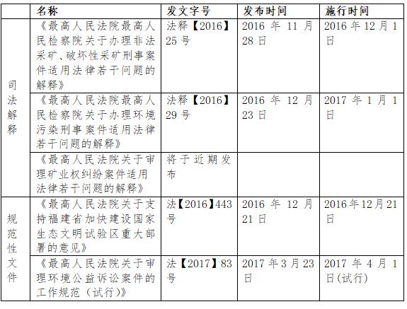 最高人民法院深入贯彻落实中央办公厅、国务院办公厅《关于设立统一规范的国家生态文明试验区的意见》及实施方案的要求,制定《最高人民法院关于支持福建省加快建设国家生态文明试验区重大部署的意见》,指导福建、江西、贵州高级人民法院充分发挥司法职能依法保障生态文明试验区建设,推进试验区生态文明领域国家治理体系和治理能力现代化。2016年9月,最高人民法院、国家林业局组成联合调研组赴四川就林权法律问题进行调研。2016年11月、12月,最高人民法院与最高人民检察院先后联合发布了《关于办理非法采矿、破坏性采矿刑事案件适用法律若干问题的解释》以及《关于办理环境污染刑事案件适用法律若干问题的解释》两部重要司法解释。2017年3月,最高人民法院、最高人民检察院、环境保护部等6家单位联合组成调研组,赴山东、江苏两省开展生态环境损害赔偿制度改革试点调研。最高人民法院与环境保护部共同推进建设环境行政执法与司法信息共享平台,构建环境资源司法和环境行政执法协调联动机制。