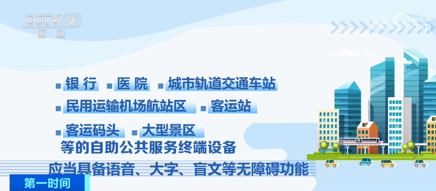 《中华人民共和国无障碍环境建设法》将于9月1日起施行,明确:新建、改建、扩建的居住建筑、居住区、公共建筑、公共场所、交通运输设施、城乡道路等,应当符合无障碍设施工程建设标准。国家支持城镇老旧小区既有多层住宅加装电梯或者其他无障碍设施。此外,银行、医院、城市轨道交通车站、民用运输机场航站区、客运站、客运码头、大型景区等的自助公共服务终端设备,应当具备语音、大字、盲文等无障碍功能。