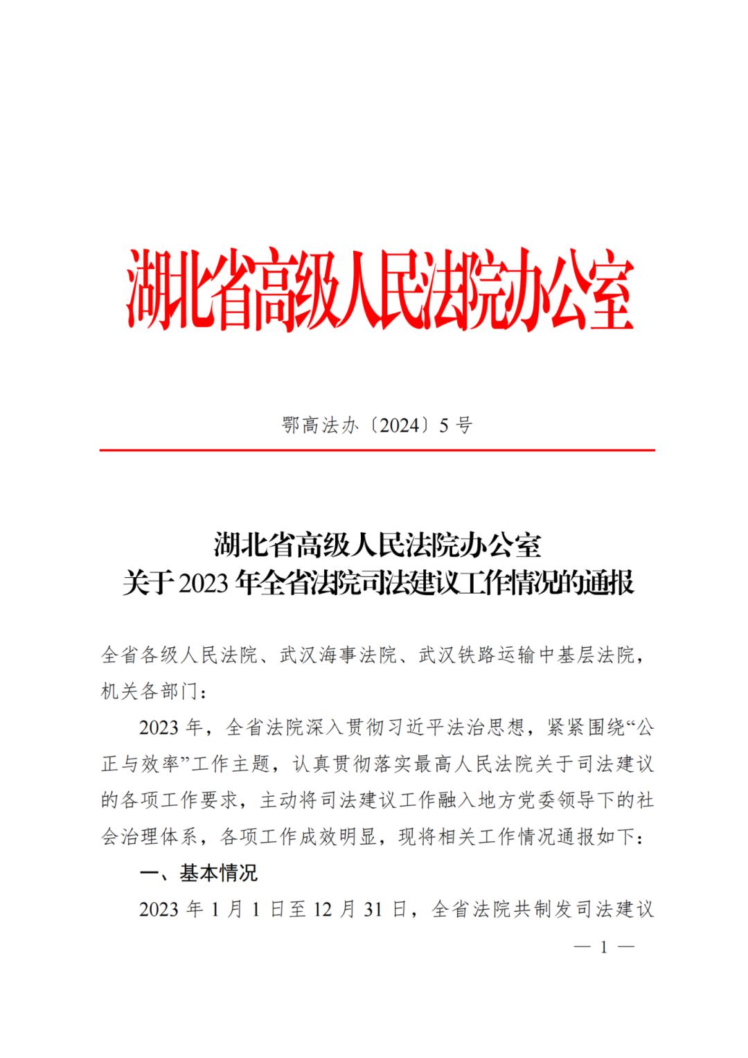 湖北高院通报表彰2023年度全省法院优秀司法建议
