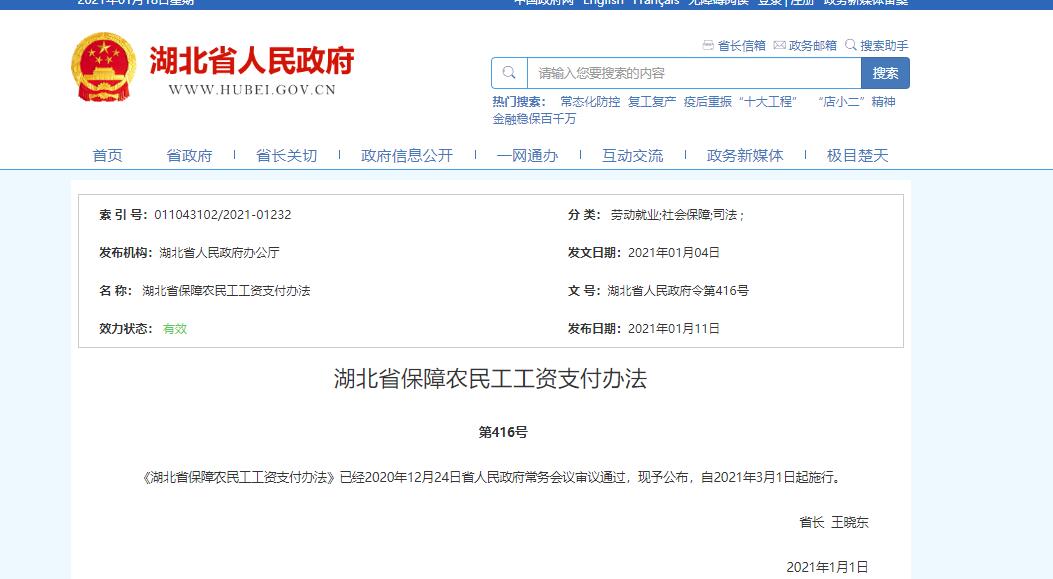 人民网武汉1月18日电 日前,湖北省政府办公厅发布《湖北省保障农民工工资支付办法》(以下简称《办法》)明确规定,县级以上人民政府负责本行政区域内保障农民工工资工作,建立保障农民工工资支付工作协调机制,加强监管能力建设,健全保障农民工工资支付工作目标责任制,将保障农民工工资支付工作纳入对本级人民政府有关部门和下级人民政府考核评价体系。各级人民政府应当建立健全工资支付预警机制、信用监管机制和应急处置机制。《办法》自2021年3月1日起施行。