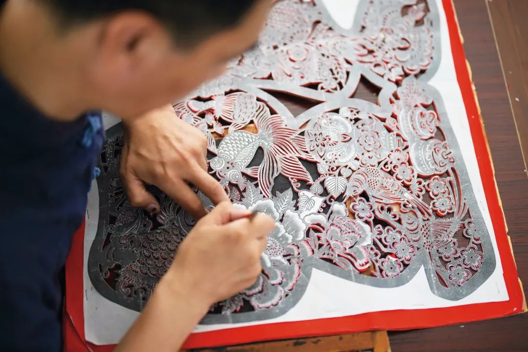 >>2023年9月16日,剪纸艺人在玉田县“非遗会客厅”工作室内创作“福”字剪纸作品。 新华社记者 牟宇/摄