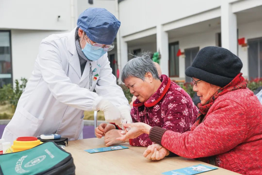 >>浙江省绍兴市越城区巡诊医生在越城区塔山街道社区卫生服务中心给老年人进行血糖监测 新华社发 徐昱/摄