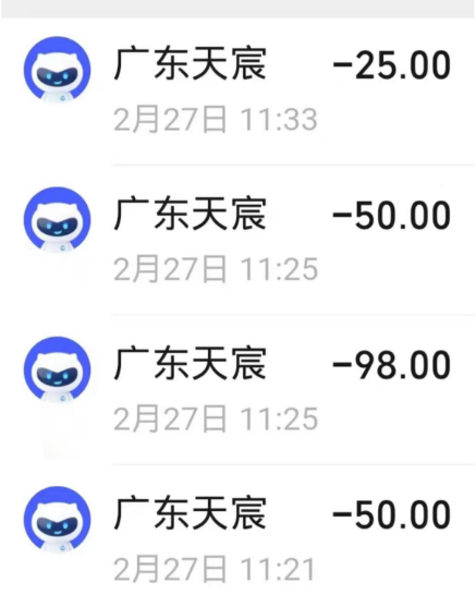 宋奶奶发给记者的截图显示,其孙子充值的收款单位为广东天宸网络科技有限公司,仅2月27日一天就充值了8次之多,每次充值25—98元不等。
