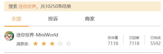记者在黑猫投诉【投诉入口】上查询发现,截止到4月4日,有关“迷你世界”的投诉高达7118件,最近30天就有156件,已完成11件,完成率不足10%,投诉的内容大多是未成年人充值退费难。