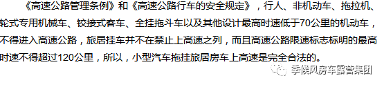 拖挂式房车一般为中置轴车辆,不同于全挂车辆的特征,属于半挂车,法律规定全挂车是不可以上高速的,小型载客汽车只允许牵引旅居挂车或者总质量700千克以下的挂车,挂车不得载人”