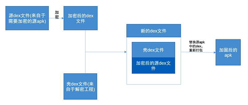 (2)dex加壳:通过对dex文件加密拼接加壳,可以有效的对工程代码进行保护。apk工程在安装成功后,app启动时会有dex解密的过程,然后重新加载解密后的dex文件。