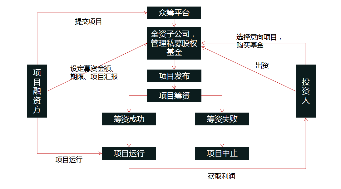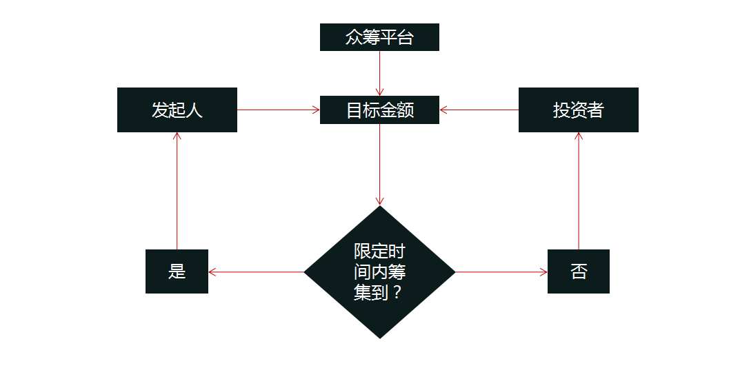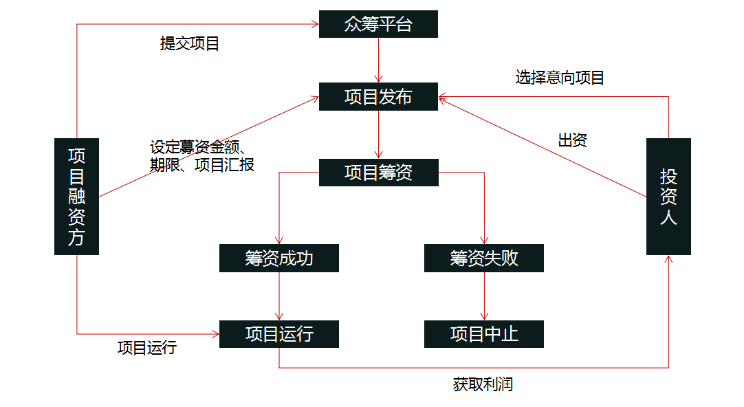 发起人可以是个人或组织,支持者选择其喜欢的项目并无偿捐赠。发起人设置一个目标金额和规定时间后在平台上发起融资项目。若未能在预定时间完成筹资,则项目失败,资金需返还出资人,反之,则项目成功。