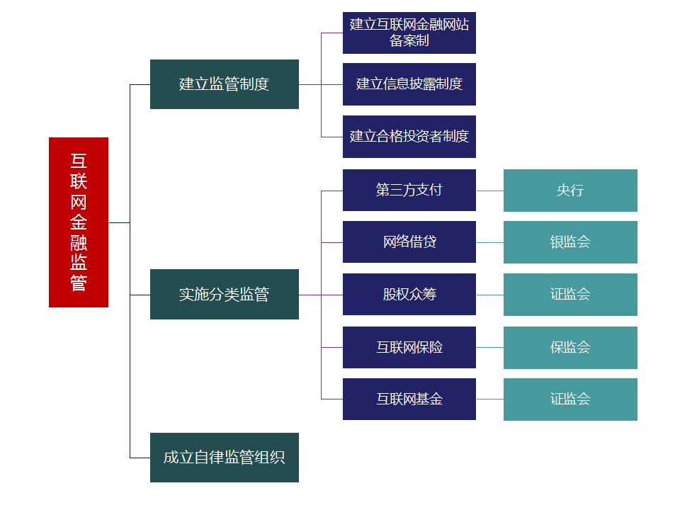 2.实施分类监管按照“依法监管、适度监管、分类监管、协调监管、创新监管”的原则,监管的重点主要集中在五大互联网金融业态,即第三方支付、网络借贷、股权众筹、互联网保险和互联网基金,分工清晰,职责明确,清楚地划分了业务的边界。