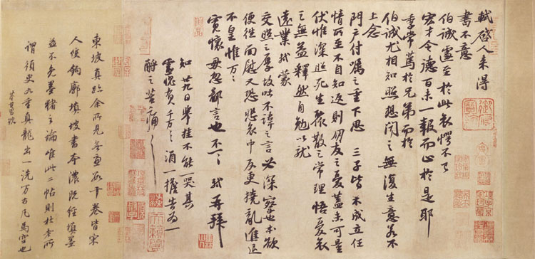 展出苏轼主题文物展品332件/套,其中有5件是来自故宫博物院的“国宝级”文物,分别为苏轼真迹《新岁展庆帖 人来得书帖》合卷和《题王诜诗词帖》,同时还有黄庭坚、米芾、蔡襄书法真迹展出。