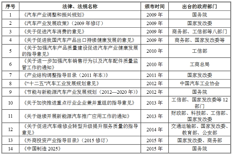 2015年5月,国务院发布《中国制造2025》,对汽车行业生产设备智能化改造、电动汽车和燃料电池汽车发展方面,探索利用产业基金、国有资本收益等渠道支持汽车行业装备和优势产能走出去、实施海外投资并购等方面提出了指导意见。