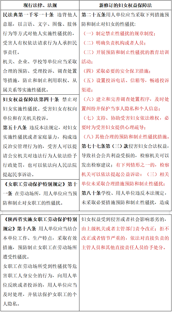 民法典第一千零一十条将性骚扰明确定义为“违背他人意愿,以言语、文字、图像、肢体行为等方式对他人实施性骚扰。”但在妇女权益保障法修订前,我国现行法律法规中对于用人单位防范性骚扰的法定义务主要停留在框架性的要求上且缺乏具体规定。相比而言,新修订的妇女权益保障法明确了用人单位在防范妇女被性骚扰方面的具体义务,涵盖了从预防机制、教育培训,到禁止和制止措施,再到妇女依法维权和心理疏导支持等全过程,使用人单位预防和制止性骚扰更具可操作性。同时,新修订的妇女权益保障法第七十七条、第八十条中对于用人单位未采取必要措施预防和制止性骚扰需承担的法律责任也予以明确规定。