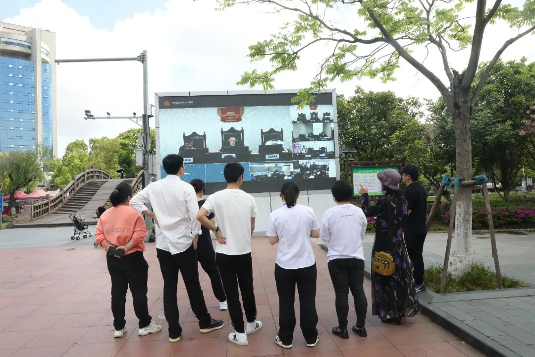 在玉环公园的大屏幕上,还进行了一场非法狩猎罪案的庭审直播——去年年底,被告人陶某伙同他人在玉环公园内使用自制弹弓捕猎多只野生鸟类。在犯罪地进行庭审直播的方式,吸引来往群众,更具警示和教育效果。