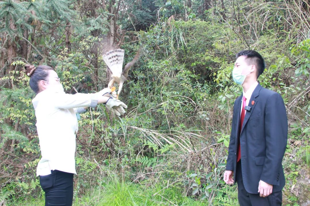 4月12日,开化法院通过设在钱江源国家公园的生态环境保护“共享法庭”在线开展爱鸟护鸟普法宣传,并联合开化县野生动植物保护协会放飞救助的国家二级重点保护动物雀鹰,与护林员一同巡山、拆除捕鸟网。