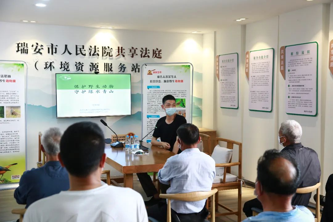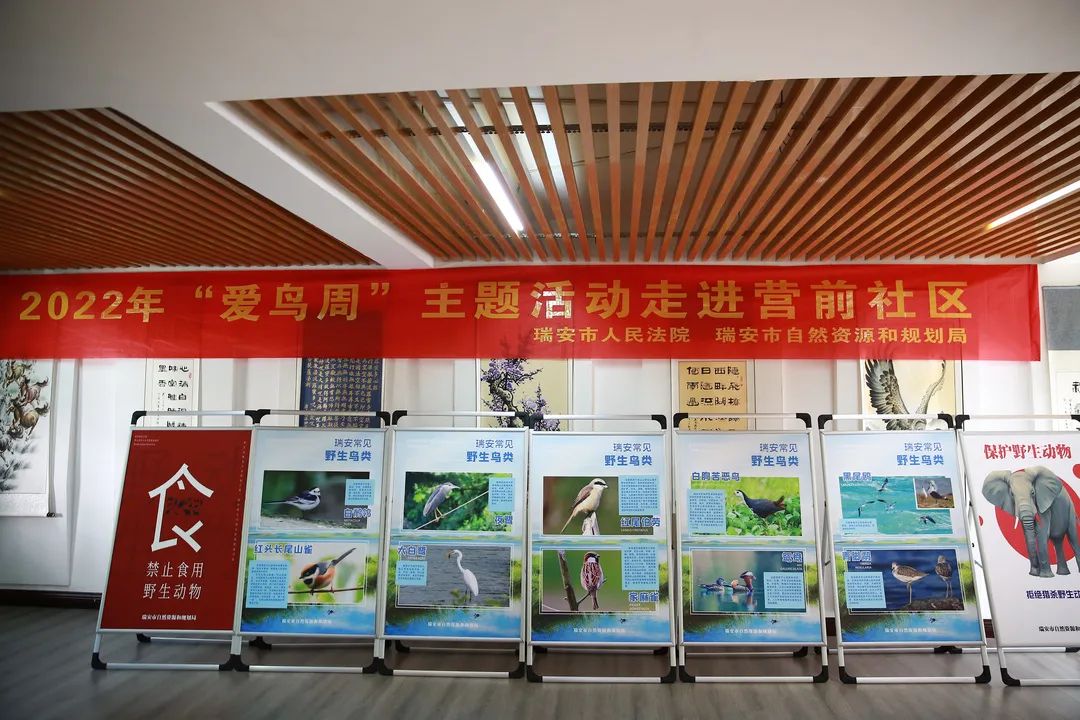 4月12日,瑞安法院在山区学校及环资“共享法庭”开展“爱鸟周”主题普法宣传活动。通过设置宣传展板、专题授课、展示鸟类野生动物标本等形式宣传鸟类保护知识和相关法律法规,并开展全市500余家“共享法庭”直播活动,展播“爱鸟周”公益广告、环资典型案件庭审视频等,呼吁公众守护蓝天精灵。