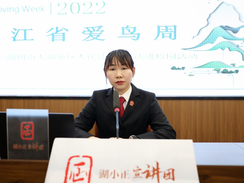 4月13日,南太湖法院的法官以湖小正宣讲团宣讲员的身份,以专业法律知识和丰富宣讲经验,在浙江省“爱鸟周”期间开展普法进校园活动。课堂上,宣讲员以案例为切入点,结合鸟类科学知识、鸟类保护法规的宣讲及与学生的互动,增强学生爱鸟护鸟的法律和生态意识,助力美好生态环境建设。