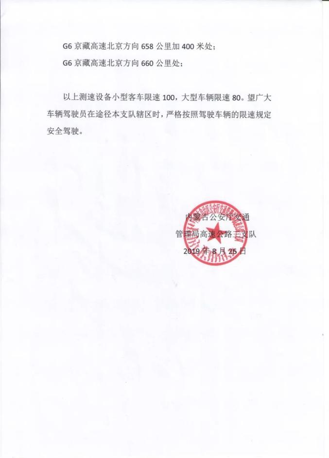 为进一步维护支队辖区高速公路通行秩序,加大超速违法行为的整治力度,预防和减少道路交通事故的发生,促进广大车辆驾驶人安全文明出行,自2019年9月15日起,按照内蒙古公安厅交通管理局高速公路三支队的统一部署,将对以下路段启用固定、区间、移动测速设备,对超速行驶的道路交通违法行为进行抓拍取证。