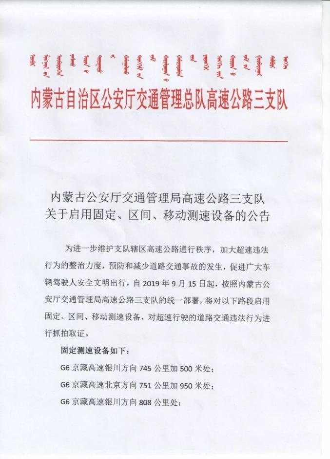 内蒙古公安厅交通管理局高速公路三支队关于启用固定、区间、移动测速设备的公告