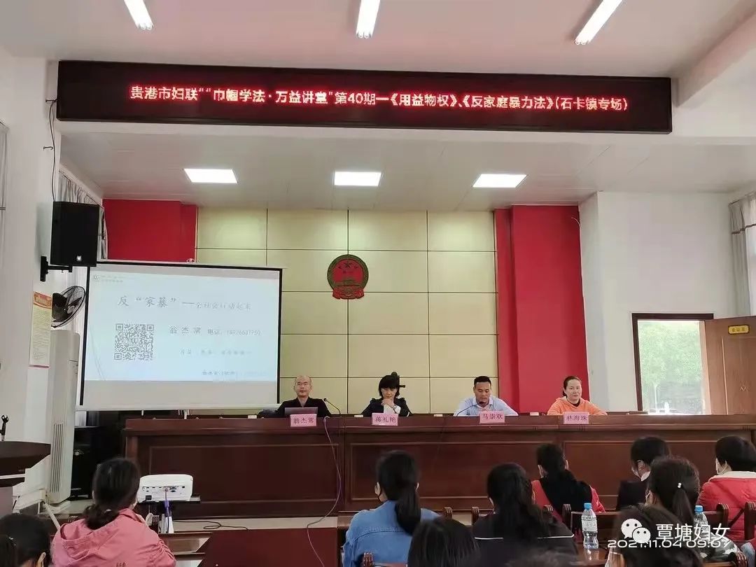 家庭暴力的存在由来已久,因婚姻家庭矛盾纠纷引发的个人极端案事件时有发生,为增强广大群众对家庭暴力危害的认识和妇女自我保护意识,加强反家庭暴力法律法规的宣传,近日,贵港市妇联联合覃塘区妇联、广西万益(贵港)律师事务所在覃塘区石卡镇政府组织开展“巾帼学法,万益讲堂”宣讲活动,覃塘妇联主席蒋礼艳、副主席林海珠,石卡镇党委副书记马崇欢、各村妇联主席和当地群众80余人参加了本次活动,本次活动以讲座形式开展。