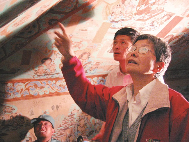 樊锦诗在莫高窟第85窟壁画修复现场检查工作