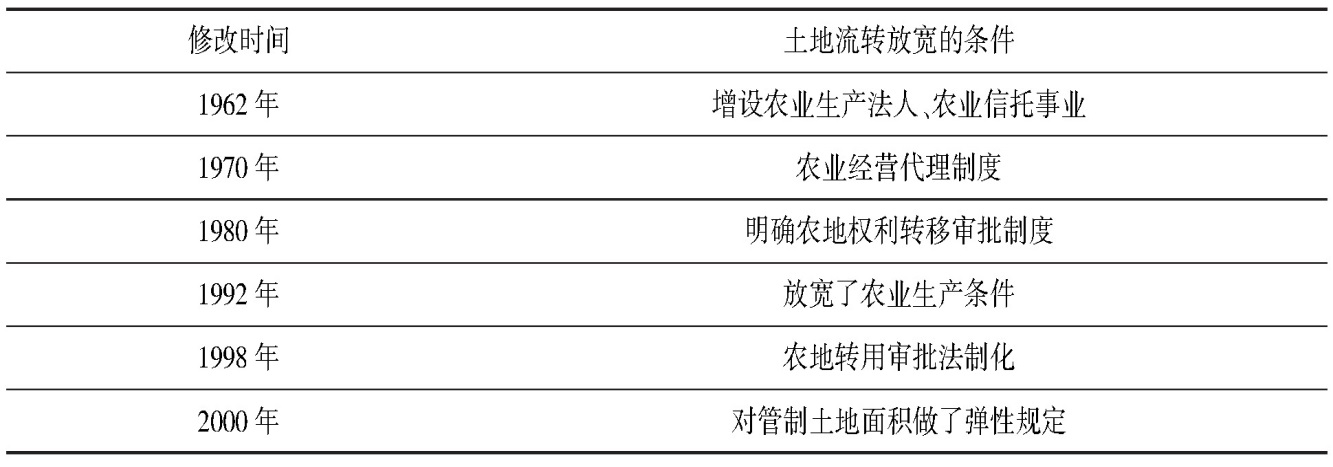 表2.日本《农地法》修改时间、放宽土地流转条件一览表