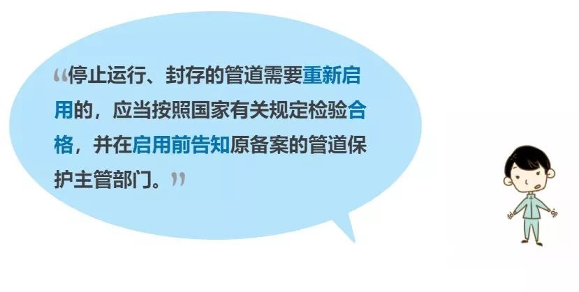 停止运行、封存的管道需要重新启用的,应当按照国家有关规定检验合格,并在启用前告知原备案的管道保护主管部门。