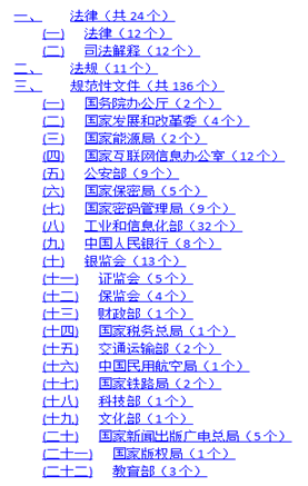 我国网络安全领域的法律法规制度体系建设起步于上世纪九十年代后期,相关的规范性制度建设在本世纪前十年中逐步配套完善,中央网络安全和信息化领导小组成立以来,我国网络安全法律法规体系建设取得了快速发展,《网络安全法》等一批重要的基础性法律法规出台。截止目前,我国网络安全领域以及与网络安全产业相关的法律法规和制度文件中,据不完全统计,全国人大发布的法律有12份,有《网络安全法》、《国家安全法》、《刑法修正案(九)》等;最高法、最高检、公安部出台的司法解释有12份,例如《关于办理侵犯公民个人信息刑事案件适用法律若干问题的解释》、《关于办理电信网络诈骗等刑事案件适用法律若干问题的意见》等;国务院出台的法规有11份,如《商用密码管理条例》等;各部委等机构出台的规范性文件有136份,涉及公安部、工信部、国家密码管理局等行业主管部门以及银监会、交通运输部、新闻出版广电总局等27个部门。