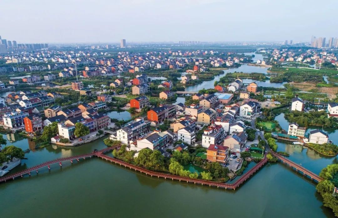 >>空中俯瞰杭州市余杭区塘栖古镇丁山湖边的水上栈道和丁河村 新华社记者 徐昱/摄