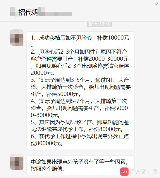 一则代孕妈妈招聘启事显示,如中途流产最高赔偿8万。