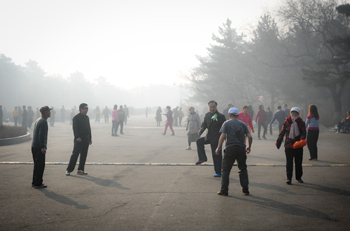 实施好新的《环境保护法》,可以给我们的生活带来一缕吹散雾霾的清风。图为长春市民在春天的雾霾中踢毽子。记者 许畅/摄