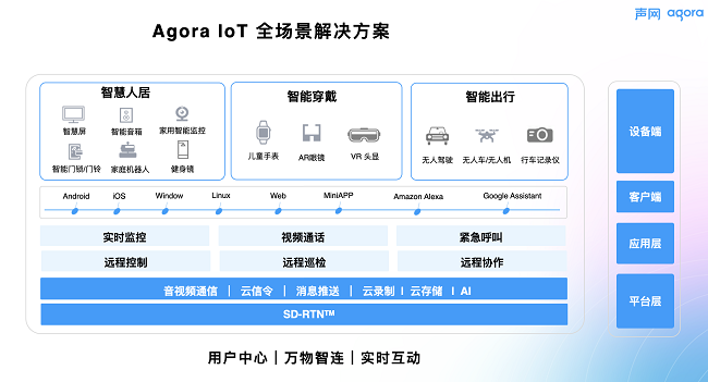 随着物联网的高速发展,除了无人机场景外,智能音箱、智能摄像头、智能机器人等一系列智能硬件也在我们的生活中快速普及,而声网同样也支持 IoT 领域的全场景,包括穿戴、家居、出行等场景,提供音视频通话+互动+消息的全场景一站式实时互动和互联互通解决方案。