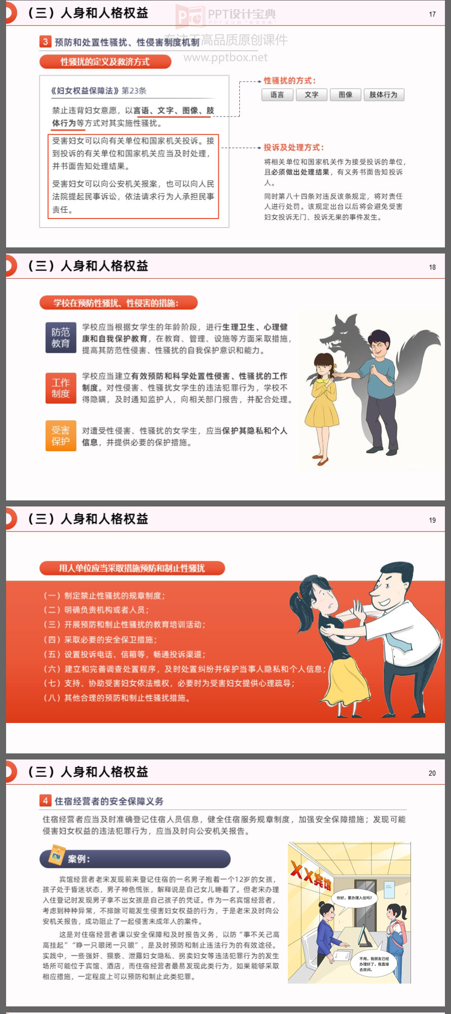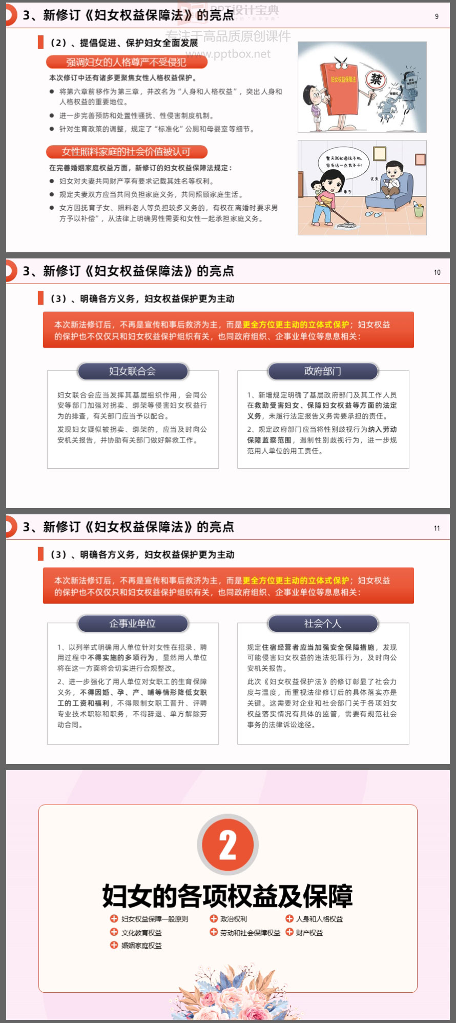 本PPT就是以新修订的《妇女权益保障法》为蓝本制作。涉及的知识点包括:新修订《妇女权益保障法》的亮点、妇女的各项权益及保障、救济措施和法律责任……等内容。