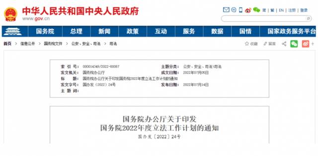 7月14日,国务院办公厅发布关于印发《国务院2022年度立法工作计划》的通知。