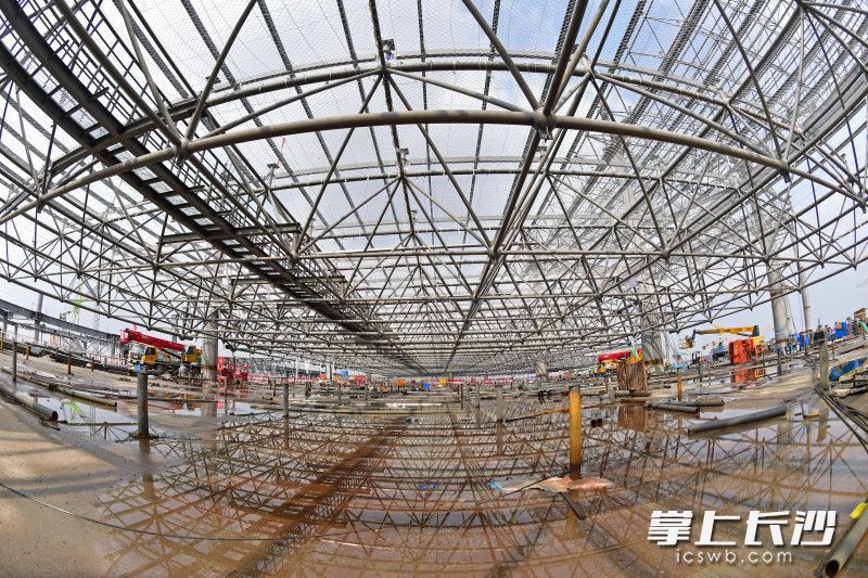中建八局长沙机场T3航站楼项目现场负责人童海波介绍,在网架施工过程中,现场共设置26个提升吊点,施工过程中安排专人全程定点监测,并在关键位置安装监测装置实时反馈监测情况到现场指挥中心,通过相关反馈数据有针对性地对每个吊点进行数字化管控,确保整体提升安全可控。“在建的T3航站楼F大厅一共有10块巨型钢网架,我们预计在2024年12月将F大厅区域网架(除南侧悬挑结构外)全部提升完毕。”