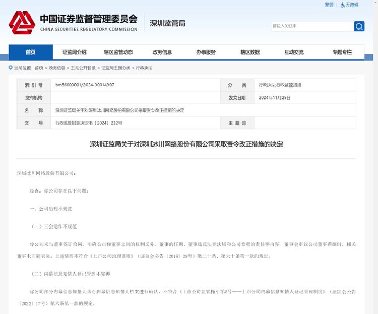 根据深圳证监局在2024年11月29日发布的公告,冰川网络(300533)因存在公司治理不规范和财务会计核算不规范的问题,受到责令改正的监管措施。