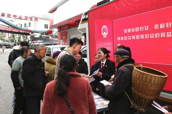 在麻旺镇集镇,法院干警利用车载便民法庭LED大屏滚动播放保障妇女权益相关宣传视频,并向群众发放了妇女权益保障、反家庭暴力、家庭教育、防范妇女儿童拐卖、防范养老诈骗等宣传小册子300余份,并接受群众法律咨询。