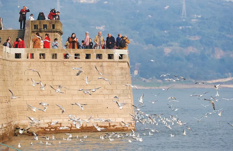 近年来,四川省泸州市着力打造生态城市,实施长江生态环境综合治理工程,飞抵泸州越冬的红嘴鸥逐年增多。图为2020年11月13日,市民在泸州东门口长江边观赏红嘴鸥。新华社发 牟科/摄