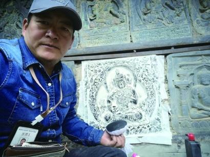 格旺当即决定制作拓片。他将宣纸覆盖在浅浮雕上,喷一些水,但是不能太多,要恰好让宣纸贴伏在石刻上。取一只乒乓球拍,在木柄的一端填上一些海绵,用布裹住,蘸墨,轻轻地在宣纸上拍。那时格旺刚学会拓印不久,他感到自己的动作有些笨拙,因此格外小心。