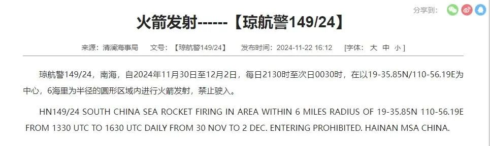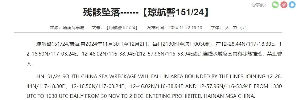 据中国海事局网站消息,清澜海事局发布航行警告,11月30日至12月2日,每日21时30分至次日0时30分,南海部分水域有残骸掉落,禁止驶入。
