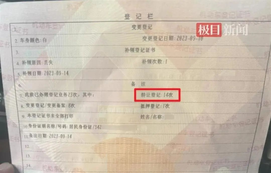陈先生告诉极目新闻记者,车辆的机动车登记证书是2023年在山东枣庄办理的。证书显示,该车于2010年3月在深圳注册登记,后又于2023年6月12日在山东枣庄、2023年8月30日在河南郑州进行了两次转移登记,而从该本机动车登记证书上无法看出,此前是否还有过其他的转移登记。