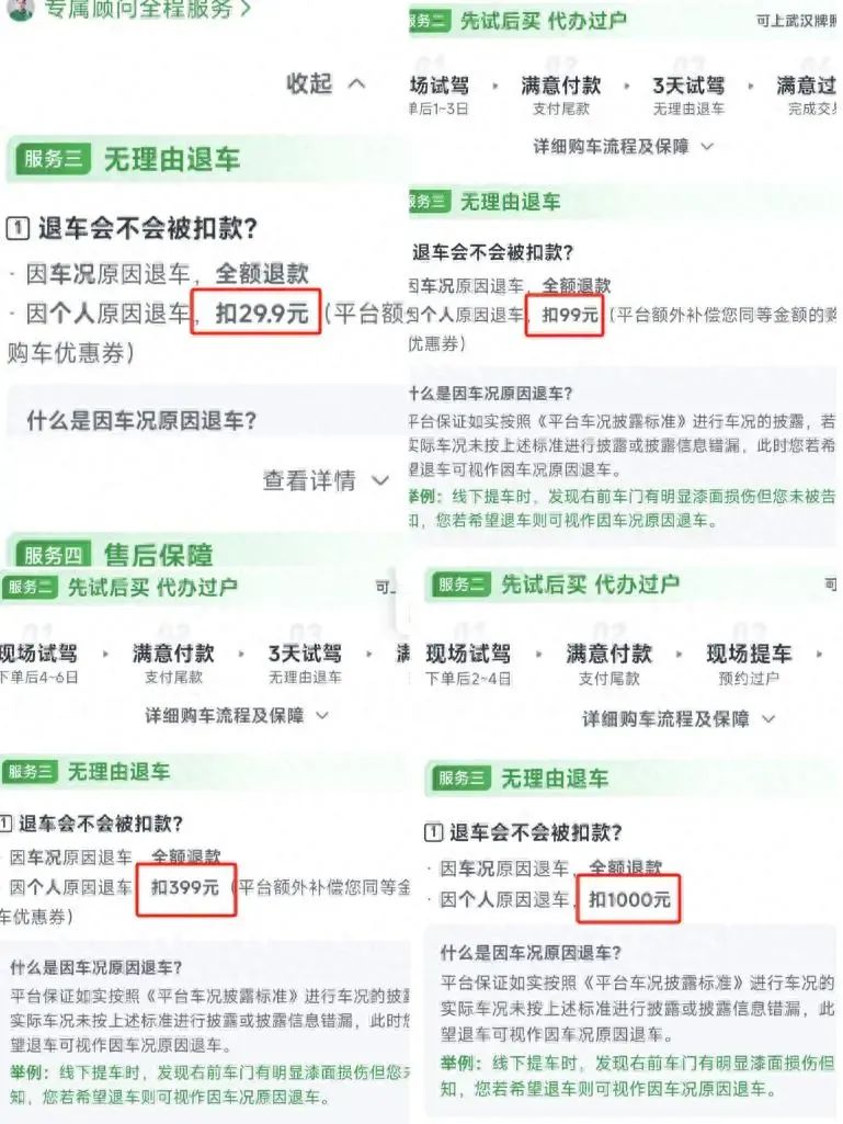 记者在瓜子二手车平台发现,不同车辆在“无理由退车”板块显示的扣款金额不同。记者随机打开数款车辆购买页面发现,部分车辆显示“因个人原因退车,扣29,9元”,但也有车辆显示扣款金额为99元、399元或1000元。