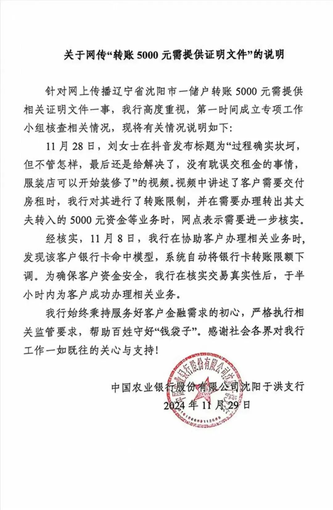 11月29日傍晚,农行沈阳于洪支行发布情况说明称,“经核实,11月8日,我行在协助客户办理相关业务时,发现该客户银行卡命中模型,系统自动将银行卡转账限额下调。为确保客户资金安全,我行在核实交易真实性后,于半小时内为客户成功办理相关业务。”