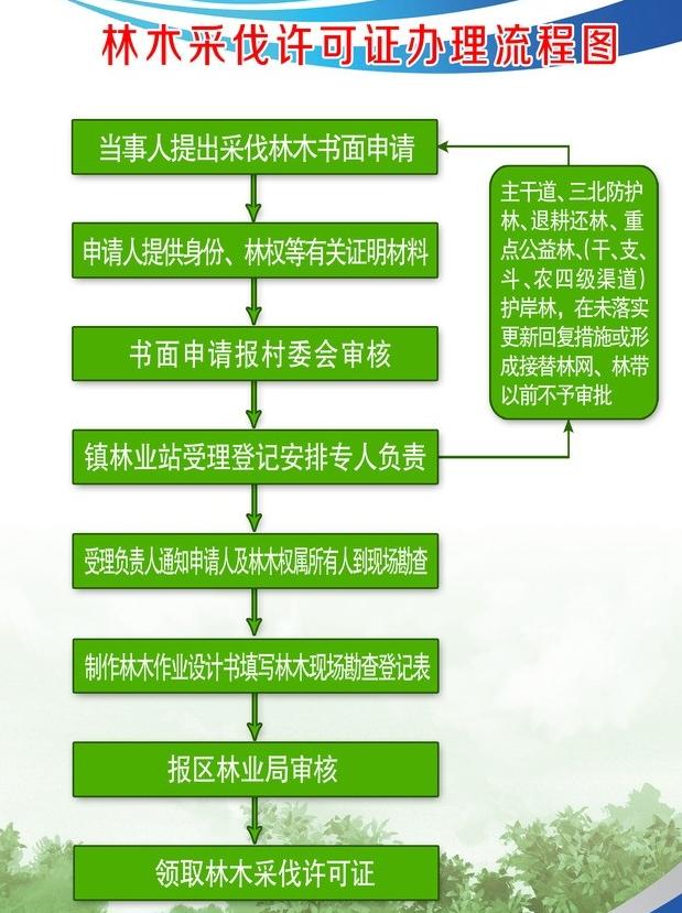 在此,法官给大家延伸说一说采伐许可证——我们国家实行林木采伐许可证制度是为了严格控制森林的年采伐量,保护森林资源。若要办理砍伐许可证,可参照图下流程进行申请办理。