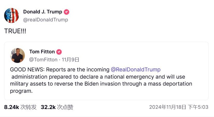 法律疑问2024年11月18日,特朗普在社交媒体发文回复保守派人士汤姆·菲顿的发帖。菲顿此前发文称,报道显示特朗普上台后将宣布美国进入全国紧急状态,并动用军事资产大规模驱逐非法移民。
